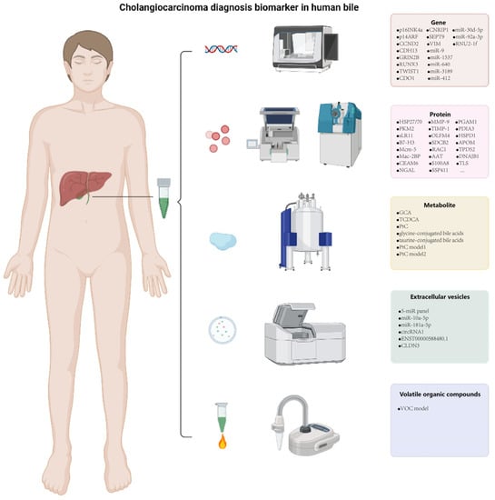 Bile secreted by the liver cells, generally stored in the gall bladder and discharged to the duodenum in the digestive process, is an important part of the biliary system. At present, the main methods to obtain bile are duodenal drainage, gallbladder puncture and direct surgery, among which surgical methods include ERCP and cholecystectomy. Moreover, the bile collected by duodenal drainage contains part of gastric juice and pancreatic juice, which is not conducive to the purification and analysis of bile. Bile samples should be transported on ice after acquisition and frozen at −80 °C until use. For different types of bile candidate markers, treatment and analysis methods are as follows: (1) Gene level: After extracting DNA from the bile, amplification of the target fragment by PCR to obtain the expression of potential diagnostic biomarkers and analysis of data []. For RNA, target RNA reverse transcription is required to form a stable CDNA before PCR amplification and data analysis, and real-time quantitative PCR is usually used [,]. (2) Protein level: enzyme linked immunosorbent assay (ELISA) or automatic immunofluorescence analysis is adopted to verify suspicious protein biomarkers in bile, but when exploring unknown diagnostic biomarkers, proteomics methods are being generally used to find markers and then checked by ELISA in bile [,,]. (3) Metabolism level: for bile metabolites, the diagnostic efficacy of suspected biomarkers is generally analyzed by magnetic resonance spectroscopy or quantitated by liquid chromatography tandem mass spectrometry [,]. (4) VOC is mainly through heating the sealed bottle containing bile and extracting the air above, and the collected gas is analyzed by ion flow tube mass spectrometry so as to identify the markers and analyze the diagnostic effect [].