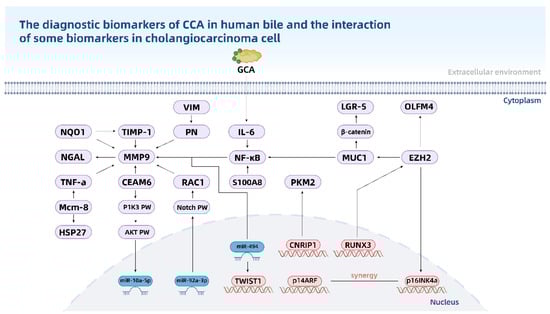 One study has proposed a new method for diagnosing CCA, which is to detect protein pattern analysis instead of looking for individual proteins. Based on this model, they proposed a diagnostic model using 22 bile polypeptides to jointly identify early CCA, with a diagnostic AUC value up to 100% []. Urine proteomics can also be used to explore the biomarker distinguishing CCA from benign biliary disease []. Voigtlander et al. have built a combined model of bile and urinary proteomics, which have a higher sensitivity and specificity to diagnose CCA than a single model []. Then, Voigtlander et al. investigate the interaction of biomarkers with the physiopathological mechanism of CCA, providing a new research direction in which diagnosis biomarkers can be used to discuss the pathogenesis of CCA [].