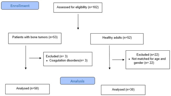 Overall, 53 patients with bone tumors and 52 healthy adults were considered eligible for the study. A total of 3 patients with bone tumors were excluded because of coagulation disorders while 30 out of the 52 eligible healthy adults were matched for age and gender with each one of the tumor patients. Therefore, the final cohort consisted of 50 patients with bone tumors and 30 healthy adults (Figure 2). The median age of the patients with bone tumors and the healthy adults was 53 (IQR: 22–66) and 55 (IQR: 53–59) years, respectively (p = 0.62). A total of 24 (48.0%) patients were male and 26 (52.0%) were female in the tumor group, while 16 (51.6%) patients were male and 14 (48.4%) were female in the control group (p = 0.86). The BMI was similar for the two groups (medians: 21 in the tumor group vs. 22 in the control group; p = 0.10), as well as the percentage of smokers (18% in the tumor group vs. 13.3% in the control group; p = 0.54). Among the 50 patients with bone tumors, 38 (76.0%) had a primary bone tumor and 12 (24.0%) had metastatic bone disease. The primary bone tumors included osteosarcoma in 20 (40.0%) patients, chondrosarcoma in 13 (26.0%) patients, malignant fibrous histiocytoma in 3 (6.0%) patients, and chordoma in 2 (4.0%) patients. The primary malignancy in the patients with metastatic bone disease included breast cancer in five (10.0%) patients, lung cancer in four (8.0%) patients, and renal cancer in three (6.0%) patients. The median length of the resected bone in the patients with bone tumors was 17.0 (IQR: 15.0–18.0) cm, indicating the extensive malignant pathology in these patients with significant tumor volume. The demographic data and tumor characteristics of the study population are summarized in Table 1.