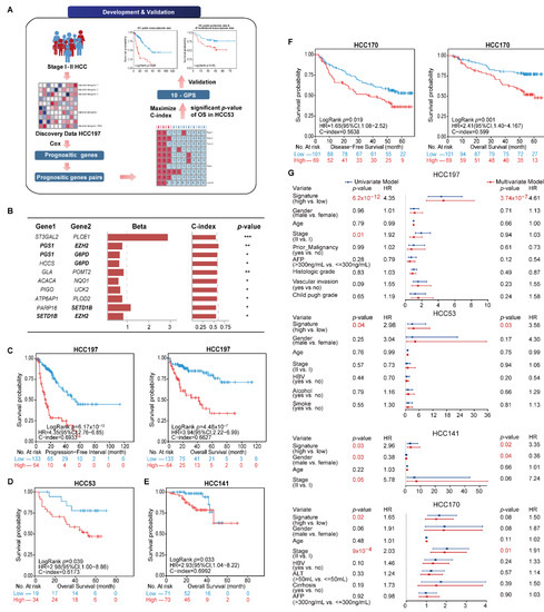 Identification and validation of 10-GPS in transcriptomic datasets. (A) The general flowchart of this study. (B) The 10-GPS for risk stratification. Genes shown in bold appeared twice in the signature. The univariate Cox regression model calculated the Beta and p-value. Beta was the risk coefficient of the REO of gene pair in 10-GPS, where Beta > 0 indicates that E1 < E2 is a risk factor and vice versa. *, **, and *** indicate p < 0.05, p < 0.01, and p < 0.001, respectively. (C,D) The 10-GPS predicted the PFI and OS of two prognostic groups in datasets HCC197 and HCC53. According to the half-voting rule, a patient was classified into the high-risk group (red line) if at least five gene pairs voted for high risk; otherwise, the patient was classified into the low-risk group (blue line). (E,F) The DFS and OS of two prognostic groups in HCC141 and HCC170 were independent validation datasets. (G) Univariate and multivariate Cox regression analyses for the 10-GPS in the discovery and validation datasets.