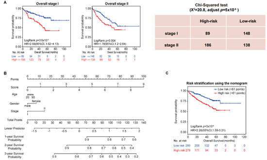 In addition, the univariate and multivariate Cox regression analysis showed that stage was an important factor in a patient’s prognosis. Then, all samples in the four datasets were integrated, and the population was split into stages. The results showed that both stage I and stage II patients were divided by the 10-GPS into two prognostic groups with significantly different OS. Specifically, significantly more patients were predicted to be at high risk in stage II than in stage I (Chi-squared test, adjusted p = 5 × 10−6, Figure 2A), indicating that stage II HCC patients were more likely to be classified into the high-risk group. Furthermore, vascular invasion is also a significant factor for HCC prognosis. Patients with and without vascular invasion in HCC197 were divided by the 10-GPS into two prognostic groups with significantly different OS (Supplementary Figure S1). No difference in vascular invasion was found between the distinct prognostic groups (Chi-squared test, adjusted p = 0.43). These results showed that the 10-GPS was associated with the OS of early HCC independent of stage and vascular invasion.