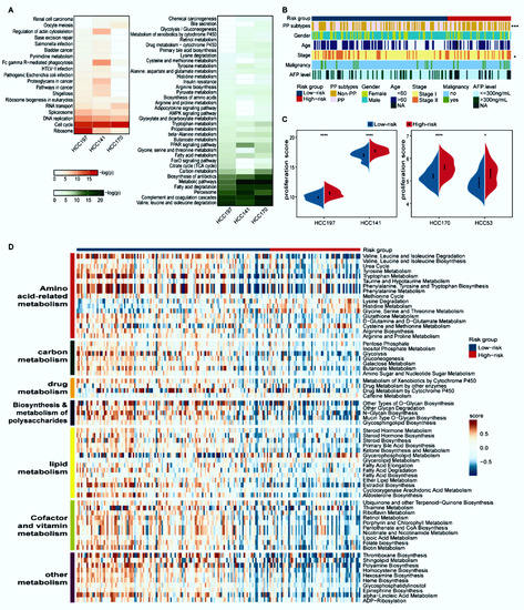 Distinct proliferation and metabolism characteristics of the two prognostic groups. (A) Functional enrichment analysis of DEGs between the two prognostic groups. Red and green respectively represent pathways enriched by the differentially overexpressed and underexpressed genes in the high-risk group compared with the low-risk group. The p-values were adjusted by BH (FDR < 5%). (B) The distribution of PP and non-PP subtypes, age, gender, stage, AFP level, and malignancy along with two prognostic groups. Patients were classified into the PP and non-PP subtypes according to the median value of the principal component analysis (PCA) of eight representative proliferation genes; * p < 0.05, *** p < 0.001. (C) The split violin plots of the average expression levels of 43 proliferation-associated genes. * p < 0.05, **** p < 0.0001. (D) Heatmap of 67 differential metabolism pathways. Blue and red bars represent low- and high-risk samples, respectively. The activity scores were quantified by GSVA using DEGs in each pathway and compared by limma with p < 0.05.