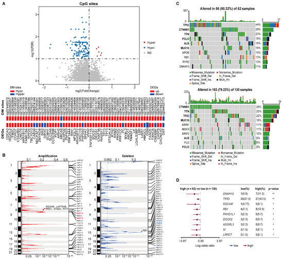 Multi-omics characteristics of the two prognostic groups. (A) The volcano plot of the CpG sites (the top pane) and the concordance of DM sites with DEGs (the bottom panel). Wilcoxon rank-sum test with FDR < 1% was used to identify the DM sites between two prognostic groups. (B) The CNV alterations of samples. The green line represents the cut-off point that determined the significance, q-value < 0.25. (C) The top 10 genes with the highest mutation rates in the high-risk (top) and low-risk (bottom) groups. (D) Genes with significant mutations in at least five samples from either prognostic group. Fisher’s exact test was used to calculate p-values. * p < 0.05, ** p < 0.01.