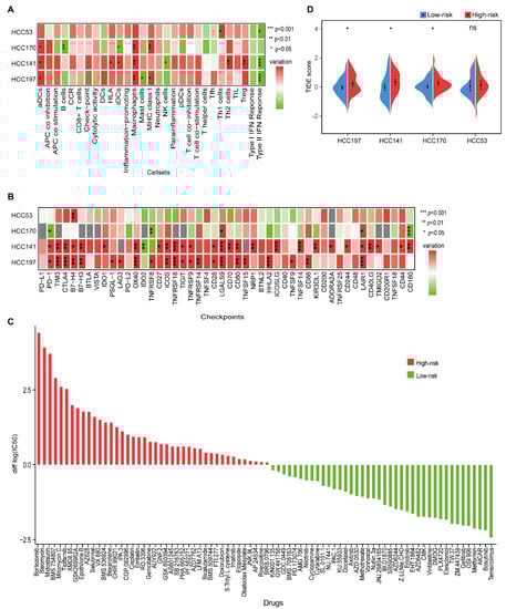 The immunologic landscape between different prognostic groups showed that higher scores of activated dendritic cells (aDCs), human lymphocyte antigen (HLA), MHC class I, macrophages, Th1 cells, Th2 cells, and Treg cells were observed in the high-risk group, while higher scores of B cells, mast cells, NK cells, and type II IFN response were observed in the low-risk group (Wilcoxon rank-sum test, p < 0.05, Figure 5A and Supplementary Figure S3). The higher scores of macrophages and Treg cells, which created an immunosuppressive microenvironment, were both correlated with a poor prognosis of HCC [42,43]. Furthermore, the higher score of type II IFN response in the low-risk group indicated an activated immune microenvironment with NK cells, which might protect against tumor development [44].