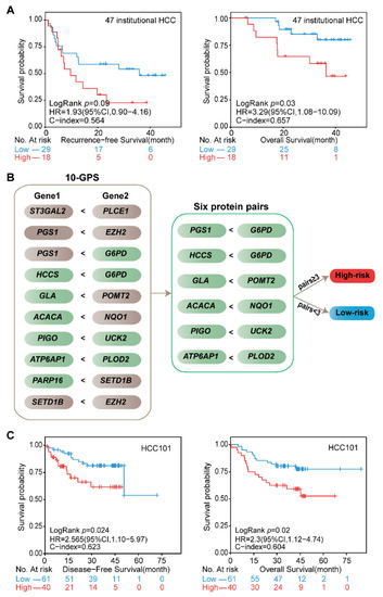 The proteomic data of 101 stage I–II HCC patients in the CPTAC data portal helped us to validate the 10-GPS at the proteomic level. In the proteomic data, 11 proteins encoded by the signature genes in the 10-GPS were measured and constructed into six protein pairs. Similarly, according to the half-voting rule, a patient was classified into the high-risk group when at least three protein pairs voted for high risk; otherwise, they were classified into the low-risk group (Figure 6B). The six protein pairs divided 40 patients into the high-risk group and 61 patients into the low-risk group, and the two groups had significantly different DFS (HR = 2.56, 95% CI: 1.1–5.97, p = 0.024, C-index = 0.623) and OS (HR = 2.30, 95% CI: 1.12–4.74, p = 0.02, C-index = 0.604) (Figure 6C). The results suggest that the 10-GPS can perform well in the proteomic data, which might facilitate its routine implementation in clinical settings.