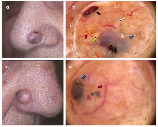 Two clinically similar, partially pigmented tumours within the ala nasi. (a,b) Trichoblastoma; dermoscopy shows branched (arborizing) vessels (red arrow), ulcerations (black arrow), large blue ovoid nests (blue arrow), yellow globules (yellow arrow), and starry milia-like cysts (white arrow) (Fotofinder Vexia; Camera Medicam 800 HD, ×20 magnification). (c,d) Nodulo-infiltrative basal cell carcinoma; dermoscopy shows branched (arborizing) vessels (red arrow), blue-grey globules (grey arrow), and large blue ovoid nest (blue arrow) (Fotofinder Vexia; Camera Medicam 800 HD, ×20 magnification).