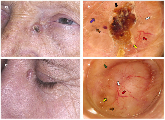 Two clinically similar tumours in the area of left medial eye canthus. (a,b) Trichoepithelioma; dermoscopy shows branched (arborizing) vessels (red arrow), superficial fine telangiectasia (violet arrow), central ulceration (black arrow), brown dots and globules (brown arrow), yellow globules (yellow arrow), and starry milia-like cysts (white arrow) (Fotofinder Vexia; Camera Medicam 800 HD, ×20 magnification). (c,d) Nodular basal cell carcinoma; dermoscopy shows branched (arborizing) vessels (red arrow), brown dots (brown arrow), starry milia-like cysts (white arrow), yellow globules (yellow arrow), and peripheral brown structureless areas (green arrow) (Fotofinder Vexia; Camera Medicam 800 HD, ×20 magnification).