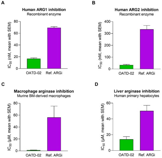 OATD-02 was tested in biochemical and cell-based assays to determine its inhibitory activity towards arginases of different origins (Figure 1A,B). A reference arginase inhibitor (ref. ARGi, numidargistat) currently evaluated in clinical trials was used for comparison. OATD-02 strongly inhibited both arginase isoforms (IC50: 17 nM ± 2 nM for ARG1, 34 nM ± 5 nM for ARG2) and—in contrast to the ref. ARGi with a predominant activity towards ARG1 (IC50: 69 nM ± 2 nM for ARG1, 335 nM ± 32 nM for ARG2)—OATD-02 proved to be a potent dual ARG1/ARG2 inhibitor. Bone marrow-derived M2-polarized macrophages were used to surrogate the myeloid suppressor cells infiltrating the tumour microenvironment. The difference in activities of the tested compounds was even more profound when we evaluated their intracellular activities towards arginase-expressing immune cells (IC50: 1.1 µM ± 0.4 µM for OATD-02 vs. 56.2 µM ± 19.0 µM for ref. ARGi) (Figure 1C). Importantly, the inhibition of the intracellular arginase was low for both compounds tested on human primary hepatocytes (IC50: 14.2 µM ± 3.4 µM for OATD-02 vs. 50.1 µM ± 7.0 µM for ref. ARGi). Given that the excessive inhibition of the urea cycle in the liver might lead to ammonia-related toxicity issues, these results indicate a similar safety profile of OATD-02 to the ref. ARGi (Figure 1D) being at the same time much more effective in the inhibition of intracellular arginases.