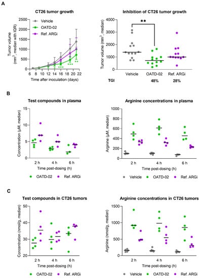 OATD-02 significantly reduces the growth of syngeneic CT26 tumours (colorectal carcinoma) in immunocompetent mice. (A)—BALB/c mice were inoculated with CT26 cells and upon 24 h dosed with OATD-02 (100 mg/kg, PO, BID) or Ref. ARGi (100 mg/kg, PO, BID) till the end of the experiment; the final tumour measurements were shown in the right graph (* 0.0281 < p < 0.0303, ** p = 0.0033, *** 0.0007 < p < 0.0008; Kruskal–Wallis test with Dunn’s multiple comparisons test). (B)—the concentrations of test compounds in plasma and corresponding l-arginine concentrations. (C)—the concentrations of test compounds in tumour homogenates and corresponding l-arginine concentrations.