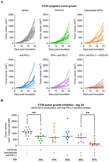 OATD-02 shows superior efficacy in the CT26 tumour model when combined with immune checkpoint inhibitor (anti-PD-L1 antibody) and IDO inhibitor (epacadostat). (A)—BALB/c mice were inoculated with CT26 cells and upon 24 h dosed with OATD-02 (50 mg/kg, PO, BID) or epacadostat (30 mg/kg, PO, BID) till the end of the experiment; anti-PD-L1 antibody was administered at 2.5 mg/kg (IP, QD at days: 8, 10, 12, 14 and 16); (B)—final measurements of tumour volumes were taken at day 24 post-inoculation and TGI was calculated (** 0.0042 < p < 0.0060, U Mann–Whitney test).