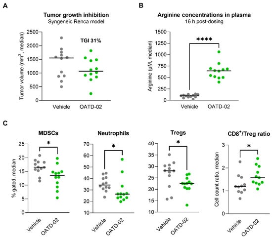 In the next step, we evaluated the activity of OATD-02 in the immunogenic Renca model, which is characterized by a strong infiltration of immunosuppressive Tregs and myeloid populations [39,40,41], as well as ARG2 expression by tumour cells [42]. In this cachexic model, a monotherapy with OATD-02 (75 mg/kg, PO, BID) resulted in partial inhibition of the tumour growth (TGI 31%, Figure 4A), however, this effect has not reached statistical significance. We have observed a strong PD effect (6.6-fold increase in plasma l-arginine 16 h upon last dose, Figure 4B), which correlated with a reversal of the immunosuppression in the tumour microenvironment, as evidenced by decreased levels of Tregs (p = 0.0196), MDSCs (p = 0.0173) and neutrophils (p = 0.0284), as well as by a beneficial increase in the CD8+/Treg cell ratio (p = 0.0281, Figure 4C). These findings further strengthen recent findings on the immunosuppressive role of ARG2 in the promotion of Treg development.