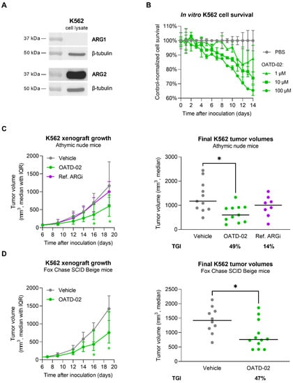 OATD-02 shows significant therapeutic efficacy in the human CML model using K562 cells. (A)—ARG1 and ARG2 expression was assessed in K562 cell lysates by SDS-PAGE/WB with specific antibodies; (B)—OATD-02 exhibited dose-dependent effect on the cell survival in a long-term K562 cell culture; (C)—Athymic nude mice were inoculated with K562 cells and test compound administration started when the xenografts became palpable (day 6); OATD-02 was dosed at 50 mg/kg (PO, BID) and Ref. ARGi was dosed at 100 mg/kg (PO, BID) until the end of the experiment; final tumour measurements were taken at day 19 post-inoculation and TGI was calculated (* 0.0172 < p < 0.0428, Kruskal–Wallis test with Dunn’s multiple comparisons test); (D)—T and NK cell-deficient mice (strain Fox Chase SCID Beige) were inoculated with K562 cells and OATD-02 was dosed at 50 mg/kg (PO, BID) from day 7 until the end of the experiment; final tumour volumes (day 19) were used for TGI calculations (* 0.0201 < p < 0.0449, U Mann–Whitney test).
