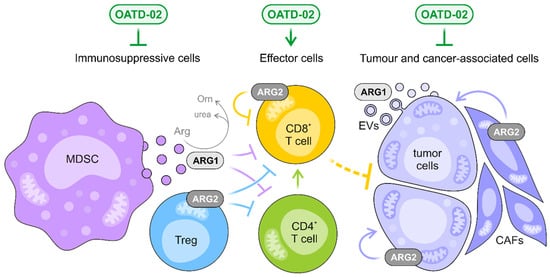 OATD-02 inhibits both extracellular and intracellular ARG1 and ARG2, interfering with multiple immunosuppressive mechanisms, and thus, restoring the effective antitumor immune response. OATD-02 may block the extracellular ARG1 secreted by myeloid-derived suppressor cells (MDSCs) and tumour cells, increasing the availability of l-arginine for effector T and NK cells, but most significantly, the molecule is able to target the intracellular arginases, i.e., cytoplasmic ARG1 and mitochondrial ARG2, that are crucial for the function of immunosuppressive cells, like Tregs, but also negatively regulate the fitness of cytotoxic CD8+ T cells. The unique properties of OATD-02 allow it to act on ARG1 packed into the extracellular vesicles (EVs) and counteract ARG2-dependent metabolic adaptations specific for both cancerous and cancer-associated cells, such as cancer-associated fibroblasts (CAFs).