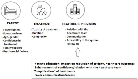 The increased use of oral cancer therapy (more than 25% of treatments in oncological patients) has been a great advance through improved outcomes and convenience of treatment administration, although long-term medication adherence is one of the challenges with this treatment modality. In a sample of 181 patients prescribed oral targeted therapy or chemotherapy, participants took only 85% of the oral therapy on average, with different percentages of poor adherence by cancer type (23.3% for hematological cancer and 42.9% for sarcoma) [37]. In a study of patients treated with oral chemotherapy, in which patient-reported outcomes (PROs) were considered, adherence of less than 80% was shown in 30% of patients, with adverse effects or concerns about adverse effects reported as the most frequent reason for non-adherence [38]. In this respect, it is important to consider the patient’s adherence to all prescribed medications for the influence of the correct use of the anti-neoplastic regimen on the outcome, as well as the increasing incorporation of oral targeted therapies as a result of advances in molecular biology. Early discontinuation of medication and non-adherence has been associated with poor outcomes and higher use of healthcare resources [39,40]. Different strategies focused on factors related to the patient, the treatment, and the healthcare system (Figure 3) should be considered to improve adherence rates and control of the disease. Intensified pharmaceutical care in the framework of multidisciplinary care can enhance adherence and prolong treatment to oral antineoplastic regimens [41]. During the entire treatment process, it is important to ensure easy communication between patients and their healthcare professionals in order to solve doubts and to assess and reinforce adherence to treatment.