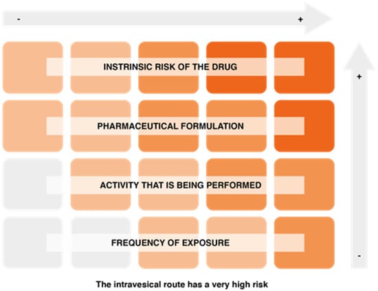 On the other hand, factors associated with the risk of exposure to hazardous drugs include the intrinsic risk of the drug, the pharmaceutical formulation and the route of drug administration (the intravesical route is one of the most risky), the activity being performed (manufacturing involves a higher risk, although the level of protection is also higher), and the frequency of exposure (Figure 5).