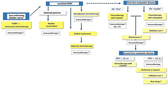 On the other hand, the improvement of safety and optimization of pharmacological treatments requires an adequate review and reconciliation of medication, management and prevention of interactions and a multidimensional, systematic, and protocolized evaluation in older patients, which facilitate appropriate adherence to the therapeutic plan, optimizing its efficacy and reducing its toxicity. The use of ICIs in the treatment of patients with bladder cancer should be based primarily on the available evidence for the indications and effectiveness of these drugs at each stage of bladder cancer.