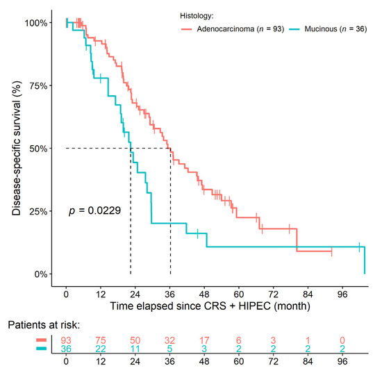 - Huang, Y.; Alzahrani, N.A.; Liauw, W.; Arrowaili, A.; Morris, D.L. Survival difference between mucinous vs. non-mucinous colorectal cancer following cytoreductive surgery and intraperitoneal chemotherapy. Int. J. Hyperth. 2018, 35, 298–304. [Google Scholar] [CrossRef]