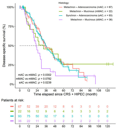Apart from the above, the prognosis of MAC as to non-MAC is still debatable [22]. Many studies support the worse survival of MAC patients when the subjects are limited to stage III and stage IV diseases [47,48,49]. Huang et al. [50] have already analyzed the survival difference between peritoneal metastatic MAC vs. non-MAC colorectal cancer following CRS + HIPEC. There was no significant difference in OS and DFS between the non-MAC and MAC groups (p = 0.657 and p = 0.938, respectively) [50]. However, all patients with peritoneal metastasis, regardless of onset (synchronous or metachronous), were analyzed together, making the comparison with the current detailed study difficult. In addition to the study of Huang et al. [50], we can report the following novel results: no difference in patient survival was found if the PM developed metachronously; however, if the PM was found synchronously at the time of tumor diagnosis, those patients with MAC CRC had significantly shorter survival times, and the median survival was more than 1 year shorter (22 months vs. 36 months). It was investigated whether any confounding effect could cause this observation, but neither the more advanced stages, the short adjuvant chemotherapy before surgery, the duration and the medication used during HIPEC, the sidedness, nor the CC score of patients affected the strong effect of MAC vs. AC.