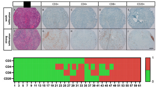 The expression of CD3, CD4, CD8, and CD20 in TILs was examined by immunohistochemistry on TMAs, as previously described [37]. For each staining, the number of immunoreactive cells in each TMA core was manually counted at ×400 magnification (×40 objective). The mean of the readings in the three related tumor cores was then calculated and represented the number of positive TIL subtypes per tumor sample. If a TMA core was lost or did not contain tumor tissue, this core was excluded for the overall evaluation. The respective median value of immunoreactive cells was used as a cutoff value for subdivision into weak and strong lymphocyte infiltration (CD3 (≥273); CD4 (≥4); CD8 (≥106), CD20 (≥7)). Examples of the different TIL groups are shown in Figure 1.
