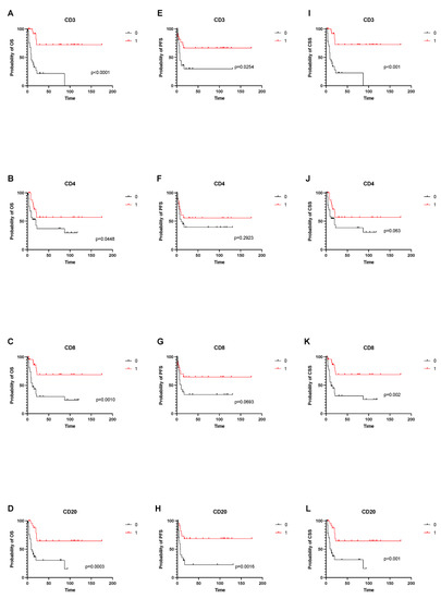 Overall, cancer-specific and progression free survival depending on tumor-infiltrating immune cells. (A–D) shows OS depending on infiltration status of CD3, CD4, CD8 and CD20 cells. (E–H) shows PFS depending on infiltrations status of CD3, CD4, CD8 and CD20 cells. (I–L) shows CSS depending on infiltrations status of CD3, CD4, CD8 and CD20 cells.