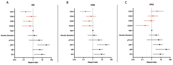 Multivariable analyses were calculated for OS, CSS and PFS. Strong infiltration of CD3+ (HR: 0.163, CI: 0.044–0.614) and CD8+ (HR: 0.265, CI: 0.081–0.864) were identified as independent predictors for improved OS and CSS. A positive nodal status (HR: 14.178, CI: 3.075–65.376) and high-grade pattern (HR: 5.189, CI: 1.288–20.901) were independent predictors for shorter OS. In addition, a strong infiltration with CD20+ (HR: 0.095, CI: 0.019–0.464) was an independent predictor for longer PFS. (Figure 3).