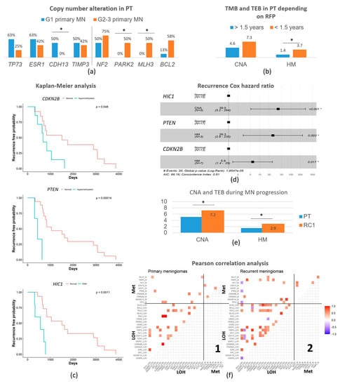 Genetic and epigenetic main characteristics. (a) Outstanding somatic copy number alterations on primary meningiomas depending on the tumor grade. (b) Copy number alterations and tumor epimutation burden (average number of epigenetic changes) according to recurrence-free survival period, divided into less than 1.5 years to the first recurrence or more than 1.5 years to the first recurrence. (c) Kaplan–Meier analysis of recurrence-free survival shows three independent prognostic factors: CDKN2B and PTEN epigenetic alterations (HM), and HIC1 copy number alteration (CNA). In each graph, the wild-type situation is in red and HM or CNA is in blue. (d) Cox Hazard ratio data to corroborate the strength of Kaplan–Meier analysis. (e) Evolution of the genetic and epigenetic burden from primary meningiomas to the first recurrence. (f) Pearson’s correlation analysis on primary meningiomas (PT) −1, and their first recurrences (RC1) −2. Positive correlations are in red meaning statistical co-alteration of a pair of genes, both in 1 and in 2. Negative correlations are in blue, meaning statistical alternations in the alteration of a pair of genes (a change detected in 1 is wild-type in 2 and vice-versa). The lower-left quadrant correlates the different CNAs among themselves on PT (1) and RC1 (2). The upper-left quadrant correlates the different CNA versus the different hypermethylation on PT (1) and RC1 (2). The upper right quadrant correlates the different hypermethylation among themselves on PT (1) and RC1 (2). The lower-right quadrant is empty. Abbreviations: GI, grade 1; GII-III, grade 2–3; MN, meningioma; PT, primary tumor; RC, recurrence; CNA, copy number alterations; TEB, tumor epimutation burden. (*) indicates p < 0.050.