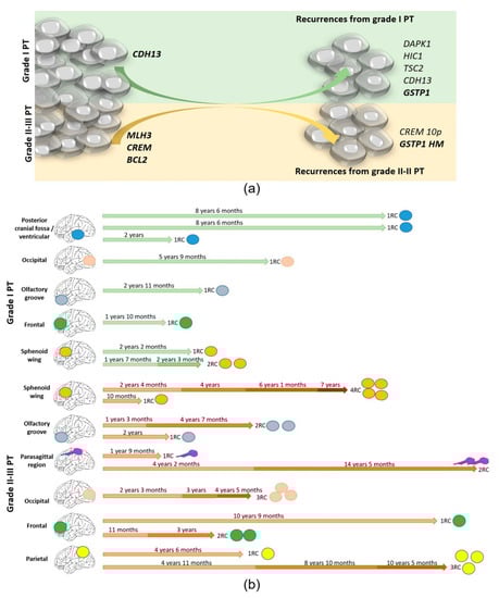 (a) The genetic and epigenetic changes in MN are different between grade 1 PTs and higher grades but frequent in both groups. Grade 2–3 PTs offer consistent alterations located in a few chromosomes (1, 14, and 18), while grade 1 PTs display randomly distributed alterations. RCs from primary grade 2 to 3 MN introduce a few changes because it is higher than its initial burden, while the progression of grade 1 MN, which displayed more random alterations initially, introduced many concrete changes when it recurs (b). Timing of the disease according to the grade of the PT (grade 1 in upper part/ grade 2–3 in lower part) indicating the location of the primary in each case.