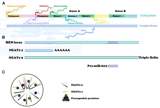 Classification of lncRNAs and structure of NEAT1: (A) LncRNAs can be categorized as enhancer lncRNAs, promoter upstream transcripts (PROMPTs), exon or intron sense-overlapping lncRNAs, long intergenic ncRNAs (lincRNAs), bidirectional lncRNAs, and natural antisense transcripts (NATs); (B) Locations of NEAT1-1, NEAT1-2, and Pre-miR-612 at the MEN locus; (C) Cross-sectional structure of paraspeckles.