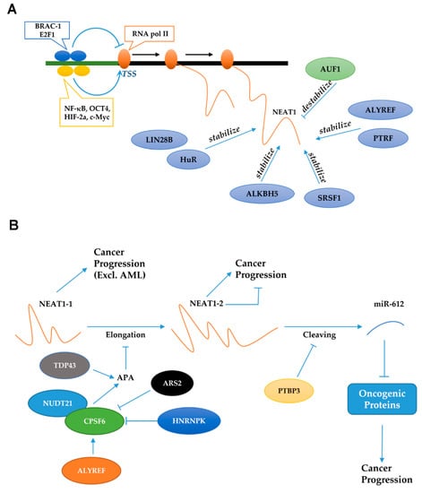 Specific proteins are responsible for the stability of NEAT1, including HuR, LIN28B, ALKBH5, PTRF, ALYREF, and SRSF1 [,,,,,]. Specifically, HuR and LIN28B can promote ovarian cancer progression via stabilizing NEAT1 [,]. In glioblastoma, PTRF can increase the stability of NEAT1 to promote cancer metastasis []. In addition, ALKBH5-stabilized NEAT1 can significantly suppress hypoxia-induced tumor-associated macrophage (TAM) recruitment and immunosuppression in glioblastoma []. ALYREF and SRSF1 can also prolong the half-life of NEAT1, facilitating the progression of breast cancer and glioma, respectively [,]. In contrast, AUF1 can destabilize NEAT1 and accelerate its decay in HeLa cells []. Stability alterations can ultimately affect the expression level of NEAT1 transcripts, thereby regulating cancer progression.