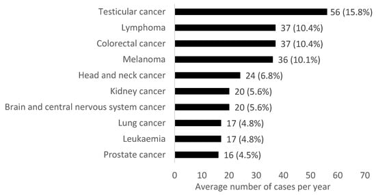 Average number of cases per year for the most common cancers (excluding non-melanoma skin cancer) in males aged 18–49 years in Northern Ireland from 2010–2019. Percentages refer to the proportion of the total average number of cancer cases per year.