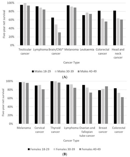(A) Five-year net survival for males by age group diagnosed in 2000–2014, followed up to end of 2019. Cancer types displayed are the cancers common to all three age groups in males. * central nervous system; (B) five-year net survival for females by age group diagnosed in 2000–2014, followed up to end of 2019. Cancer types displayed are the cancers common to all three age groups in females.