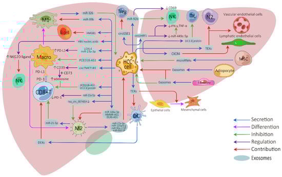 The HCC TME is an elaborate immunosuppressive microenvironment composited of different types of cells, growth factors, proteolytic enzymes, extracellular matrix proteins, and cytokines [25]. In HCC TME, not only immune cells but also non-immune cells are involved in tumorigenic processes, including tumor proliferation, invasion, and metastasis [26,27]. Recent studies have highlighted the critical role of exosomes for cell-to-cell communication in the HCC TME, which are recognized as a key factor in tumor progress and may be closely associated with resistance to immunotherapy in HCC patients [28,29].