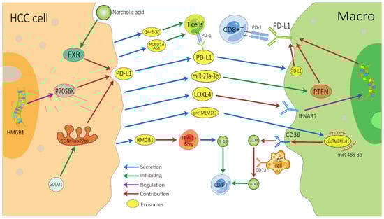 Tumor-cell-derived exosomes can be directly transported into CD8+ T cells, tumor-infiltrating T cells, or regulatory T cells to inhibit their anti-tumor function or modulate their cellular behaviors [30,31,32,33]. Furthermore, HCC-derived exosomes can induce nature killer (NK) cell activation, attenuate NK cell cytotoxicity, and arrest them to secret cytokines [34,35,36]. HCC-derived exosomes can effectively activate dendritic cells (DCs) due to their ability to carry HCC antigens [37], while DC-derived exosomes (DEXs) can potentiate anti-tumor immune responses against HCC by contributing to the activation of CD8+ T cells and reshaping the TME [38,39,40]. Depending on the substances they carry, HCC-derived exosomes show apparently contradictory roles on macrophages. They can directly influence the expression of macrophage cell surface receptors or membrane-associated signaling molecules [32,41,42,43,44] and can affect the differentiation of macrophages into two different directions: M1 (anti-tumorigenic) [45] or M2 (pro-tumorigenic) macrophages [46,47,48,49]. Furthermore, macrophage-derived exosomes can also affect HCC development or other immune cell functions [50,51,52,53,54,55,56,57]. High-mobility group box1 (HMGB1) is an evolutionarily conserved DNA-binding nuclear protein which has been demonstrated to be expressed on tumor-derived exosomal membranes. Recent study has revealed that HCC-derived exosomal HGMB1 can foster HCC immune evasion by promoting TIM-1+ regulatory B cell expansion [58]. Exosomes derived from myeloid-derived suppressor cells, a type of special cell in tumor immunity, play important immunoregulatory roles in cancers, and tumor-derived exosomes also regulate the function of myeloid-derived suppressor cells [59,60,61]. Unfortunately, no relevant studies have been undertaken in HCC.