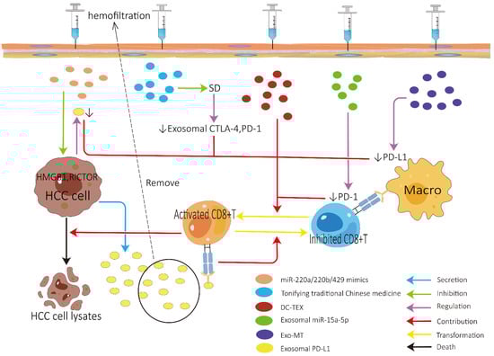 Inhibiting the expression of PD-1/PD-L1 on the cell surface of immune cells by exosomes also has significant therapeutic potential. The efficacy of ICIs may be enhanced by downregulating the expression of PD-L1 on macrophages, which may be accomplished by the administration of exosomes derived from HCC cells treated with melatonin [92]. Tumor-derived exosomal miR-15a-5p may also enhance the efficacy of ICIs by inhibiting PD-1 expression in CD8+ T cells. Furthermore, the therapeutic response to PD-1 inhibitor can be augmented by targeting β-catenin using exosome-encapsulated small interfering RNA [93]. Finally, Teng et al. clarified that the simultaneous use of DC vaccine can also augment the efficacy of PD-1 inhibitor in HCC mice [94]. Notably, DCs used in this study were DCs pulsed with HCC cell lysates, which are less effective than TEX-pulsed DCs (DC-TEX) [37,95]. Thus, a combination treatment using both DC-TEX and PD-1 inhibitor may be a more ideal choice for HCC patients. Another study, to some extent, supports the above view that a combined use of DC-TEX and PD-1 inhibitor could enhance the efficacy of sorafenib, but treatment with either DC-TEX or PD-1 inhibitor alone did not [96]. As we illustrate before, SD may restrict the efficacy of ICIs by upregulating the expression of exosomal CTLA-4 and PD-1 [85]. Thus, for HCC patients with SD, the efficacy of ICIs may be reinforced by treating SD through the administration of tonifying traditional Chinese medicine. There was a novel investigation into modifying the exosomes to display monoclonal antibodies on the exosome surface to treat epithelial malignancies [97], indicating that we may strengthen the efficacy of ICIs for HCC patients by reprogramming exosomes to display monoclonal antibodies against PD-1, PD-L1, or CTLA-4 on the exosome surface.