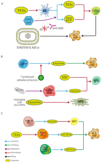 Mesenchymal stem cells (MSCs) are also considered to be a promising therapeutic approach for HCC treatment. As early as ten years ago, Ma and colleagues elucidated that the homologous TEXs could enhance the migratory capacity of bone MSCs (BMSCs) and promote their anti-tumor effects against HCC [117]. BMSC-derived exosomal miR-338-3p had also been proved to effectively inhibit HCC development by down-regulating EST1 [118]. In addition, adipose-derived MSCs exosomes might promote the anti-tumor response of NKT cells, and human umbilical cord MSCs exosomal miR-451a targeting ADAM10 could restrict the epithelial–mesenchymal transition of HCC cells [119,120]. These findings provide a solid foundation for the application of MSCs in clinical immunotherapy of HCC.