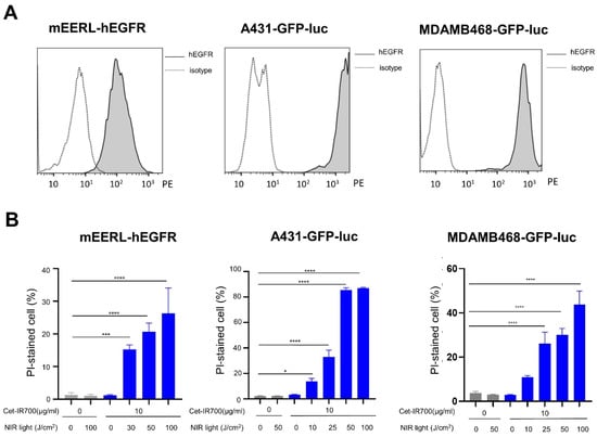 Efficacy of the NIR-PIT with Cet-IR700 in vitro: (A) In vitro hEGFR expression on mEERL-hEGFR, A431-GFP-luc, and MDAMB468-GFP-luc cells by flow cytometric analysis; (B) cell death induced by NIR-PIT with Cet-IR700 analyzed by flow cytometry using propidium iodide (PI) staining (n = 4; one-way ANOVA followed by Tukey’s test; *, p < 0.05; ***, p < 0.001; ****, p < 0.0001).
