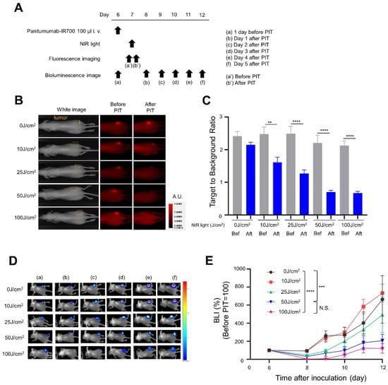 In vivo short-term efficacy of NIR-PIT with Pan-IR700 in A431-GFP-luc cells: (A) NIR-PIT regimen—bioluminescence and fluorescence images were obtained at each time point indicated; (B) fluorescence images for IR700 fluorescence—the yellow areas represent the location of the tumor (A.U., arbitrary unit); (C) target-to-background ratios (TBRs) of the IR700 fluorescence (n = 10; one-way ANOVA followed by Tukey’s test (**, p < 0.01 and ****, p < 0.0001; Bef: before; Aft: after); (D) Bioluminescence images were acquired in a series before and after NIR-PIT; (E) luciferase activity was quantified from BLI and shown as a relative percentage of the pretreatment signal intensity in each light dose treatment group (n = 10; one-way ANOVA followed by Tukey’s test; ***, p < 0.001 and ****, p < 0.0001; N.S.: not significant).