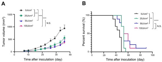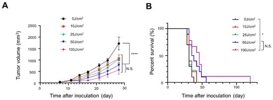 In vivo long-term efficacy of NIR-PIT with Pan-IR700 in A431-GFP-luc cells: (A) tumor volume curve (n = 10; one-way ANOVA followed by Tukey’s test; ****, p < 0.0001; 0 J/cm2 group vs. the other groups; N.S.: not significant; 50 J/cm2 vs. 100 J/cm2); (B) Kaplan–Meier survival curve (n = 10; log-rank test with Bonferroni correction; *, p < 0.05; N.S.: not significant).