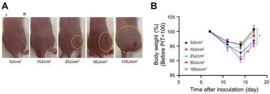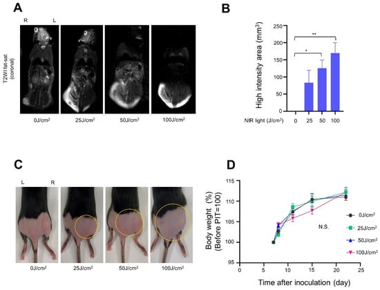 Weight change and edema were evaluated as side effects of treatment. Stress in mice was monitored by loss of body weight. T2WI fat-sat MRI quantified the degree of edema in the mice on the day after irradiation. The area and severity of edema increased in a light-dose-dependent manner, and skin pallor was observed in the 100 J/cm2 groups (Figure 7A–C). In the treated mice, body weight increased the day after treatment in the high-light dose groups due to the temporary edema. However, after one week, body weight in the 100 J/cm2 treatment group was less than that in other groups (Figure 7D). These side effects intensified in a dose-dependent manner.