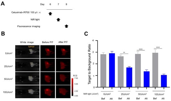 In vivo short-term efficacy of NIR-PIT with Cet-IR700 in mEERL-hEGFR tumors: (A) treatment schedule; (B) IR700 fluorescence images for IR700 fluorescence were obtained in each NIR light dose before and after NIR-PIT. The yellow areas represent the location of the tumor (A.U., arbitrary unit); (C) target-to-background ratio of IR700 fluorescence. (n = 10; one-way ANOVA followed by Tukey’s test; **, p < 0.01 and ****, p < 0.0001; Bef: before; Aft: after).