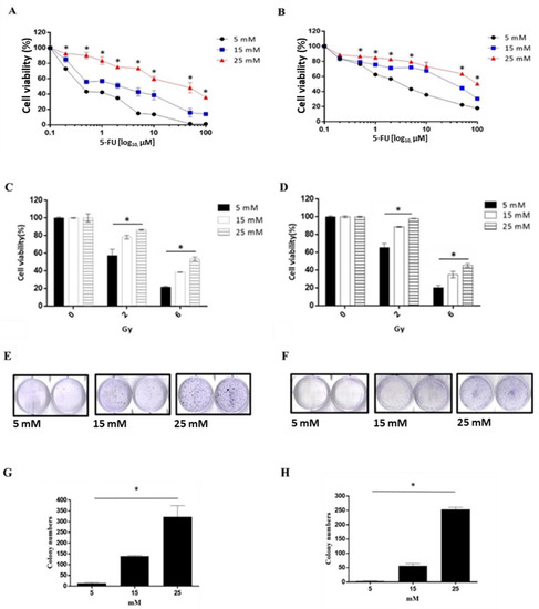 3.4. A High Glucose Environment Increases the 5-FU and Radiation Tolerance in Rectal Cancer Cell Lines