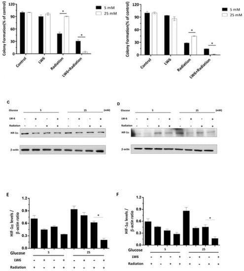 3.6. LW6 Reduces the Radiation Tolerance of Rectal Cancer via Inhibiting the Expression of HIF-1α in a High Glucose Environment