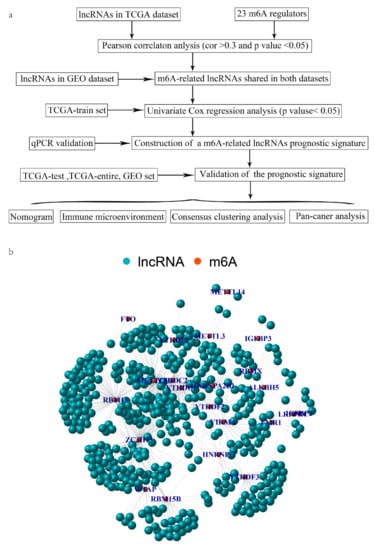 (a) Flow chart of the study and (b) co-expression network diagram of m6A regulators and lncRNAs in the TCGA dataset.
