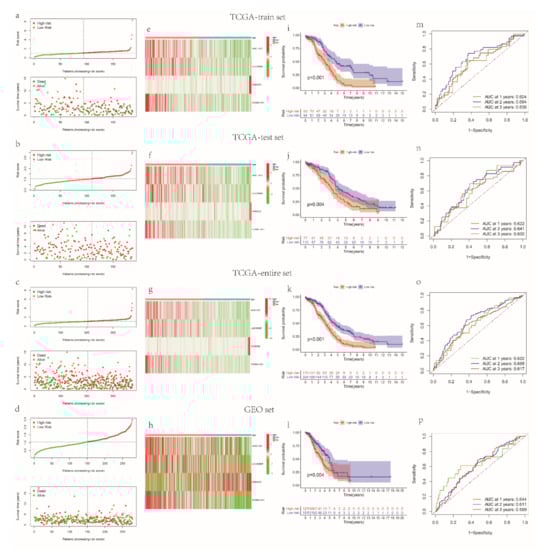 Construction and validation of the mRL prognostic signature. Distribution of risk score, OS status (a–d) and heatmap of the expression of the four prognostic mRLs (e–h) in the TCGA-train, test, entire and GEO dataset. (i–l) Kaplan–Meier curves of OS for OV patients with a high- or low-risk score in the TCGA-train, test, entire and GEO dataset. (m–p) Time-dependent ROC analysis of risk score in predicting the prognosis in the TCGA-train, test, entire and GEO dataset. ROC, receiver-operating characteristic. In the TCGA-train set, N = 187; in the TCGA-test set, N = 187; in the TCGA-entire set, N = 374; in the GEO set, N = 278.