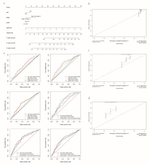 A nomogram for OV patients in TCGA dataset. (a) A nomogram for predicting the 1-, 2- and 3-year OS of OV patients. (b–d). Calibration curves for the prediction of 1-, 2- or 3-year overall survival of OV patients. (e) Time-dependent ROC curves for each parameter and the combination of independent prognostic risk factors in the TCGA dataset (for predicting 1, 2 and 3-year OS). In the TCGA-entire set, N = 374.