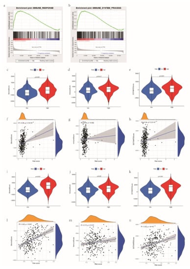 The correlation between risk score and immune features in the TCGA dataset. (a,b) GSEA showed that immune response and immune system process were enriched in the high-risk group. (c–e) Stroma, immune and ESTIMATE scores in the high- and low-risk groups in TCGA dataset. (f–h) The correlation between risk score and stroma, immune and ESTIMATE scores in TCGA dataset. (i–k) Stroma, immune and ESTIMATE scores in the high- and low-risk groups in GEO dataset. (l–n) The correlation between risk score and stroma, immune and ESTIMATE scores in GEO dataset. In TCGA-entire set, N = 374; in GEO set, N = 278.