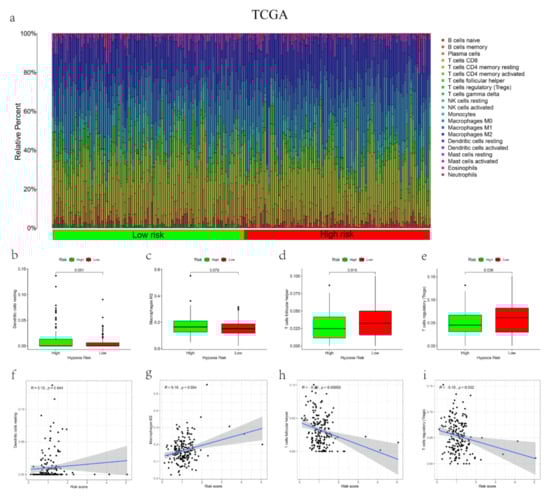 Relationships between the risk score and immune cell infiltration and the role of the mRLs in tumor microenvironment in TCGA dataset. (a) The proportion of 22 immune cells infiltration in high- and low-risk groups. (b–i) Correlation of expression of the mRLs and infiltration of specific immune cell type. In TCGA-entire set, N = 374.