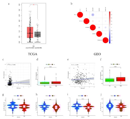 The expression level of PD-L2 was higher in tumor tissues than in normal tissues (p < 0.05, Figure 6a), and it was markedly higher in people with a high risk score in both the TCGA and GEO dataset (p < 0.05, Figure 6c–f), suggesting that people in the high-risk group will benefit less from immune checkpoint inhibitors (ICIs). In addition, LINC00997 showed a high correlation with PD-L2 (Figure 6b); thus, the function of LINC00997 in the tumor immune microenvironment deserves further research. Comparing the IPSs between the groups, low-risk groups had significantly higher IPSs, suggesting a more immunogenic phenotype (Figure 6g–j). These results all demonstrate that the signature can predict the efficacy of immunotherapy for OV patients.