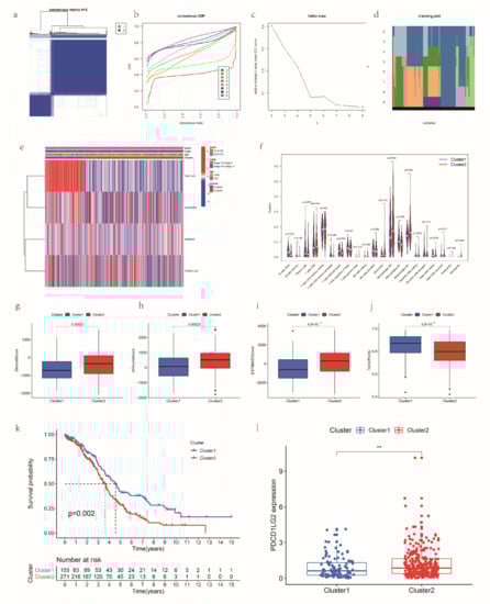 After the consensus clustering, OV patients in the TCGA dataset were classified into Cluster 1 and Cluster 2 subgroups following the expression of the significant prognostic mRLs (Figure 7a–d). The heatmap of the expression pattern between Cluster 1 and Cluster 2 subgroups was performed in Figure 7e. In addition, the stroma, immune and ESTIMATE scores were markedly higher and the tumor purity was substantially lower (p < 0.05) in Cluster 2 (Figure 7g–j). Moreover, the infiltration of naïve B cells (p < 0.05), T cell activated memory CD4 cells (p < 0.05), T follicular helper cells (p < 0.05), M1 macrophages (p < 0.05) and resting mast cells (p < 0.05) was higher in the Cluster 1 subgroup, whereas the abundance of M0 macrophages (p < 0.05), M2 macrophages (p < 0.05), activated mast cells (p < 0.05) and neutrophils (p < 0.05) was higher in the Cluster 2 subgroup (Figure 7f); thus, the Cluster 2 subgroup tended to behave more as immunosuppressive phenotype. Moreover, the results of Kaplan–Meier analyses highlighted that the OS of Cluster 2 was dramatically worse than that of Cluster 1 (Figure 7k), and the expression of PD-L2 was higher in Cluster 2 (Figure 7l); this indicates that patients in the Cluster 2 may respond more sensitively to immunotherapy. The above results all demonstrate that the expression of the mRLs influences the TME, leading to different prognoses.