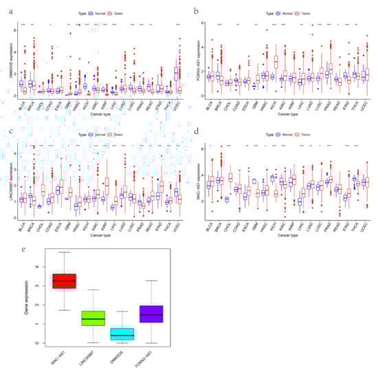 We used the pan-cancer data of 33 cancers from TCGA to further study the relationships between the four mRLs and immune features, stem-like properties and patient prognoses in pan-cancer. The expression pattern of lncRNAs in 33 cancers (Figure 8a–d) and the heatmap (Figure S9a) showed inter-tumor heterogeneity, but in most cancers, the expression level of WAC-AS1 was higher in tumor tissues, whereas the expression level of DNM3OS was the opposite, which was consistent with the expression trend in OV (Figure S2). The expression distribution of the four mRLs across all 33 cancer types showed the same trend as the above results (Figure 8e). Moreover, there is no significant correlation between the key mRLs (Figure S9b). The Kaplan–Meier analyses (Figure S9c) and univariate regression (Figure S10a) analyses showed that the role of the mRLs in the survival of patients with different cancers varied.